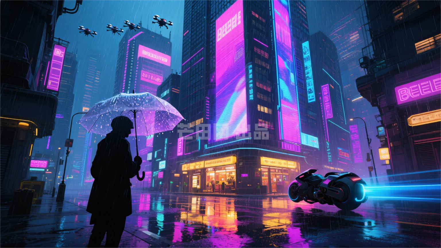 标签:赛博,霓虹,雨夜,都市,光轨,倒影,未来,科技