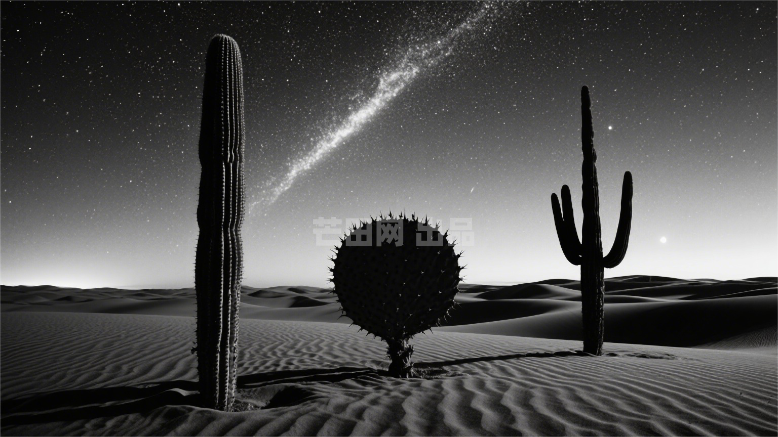 标签:星空,沙漠,仙人掌,银河,沙丘,剪影,黑白,孤寂
