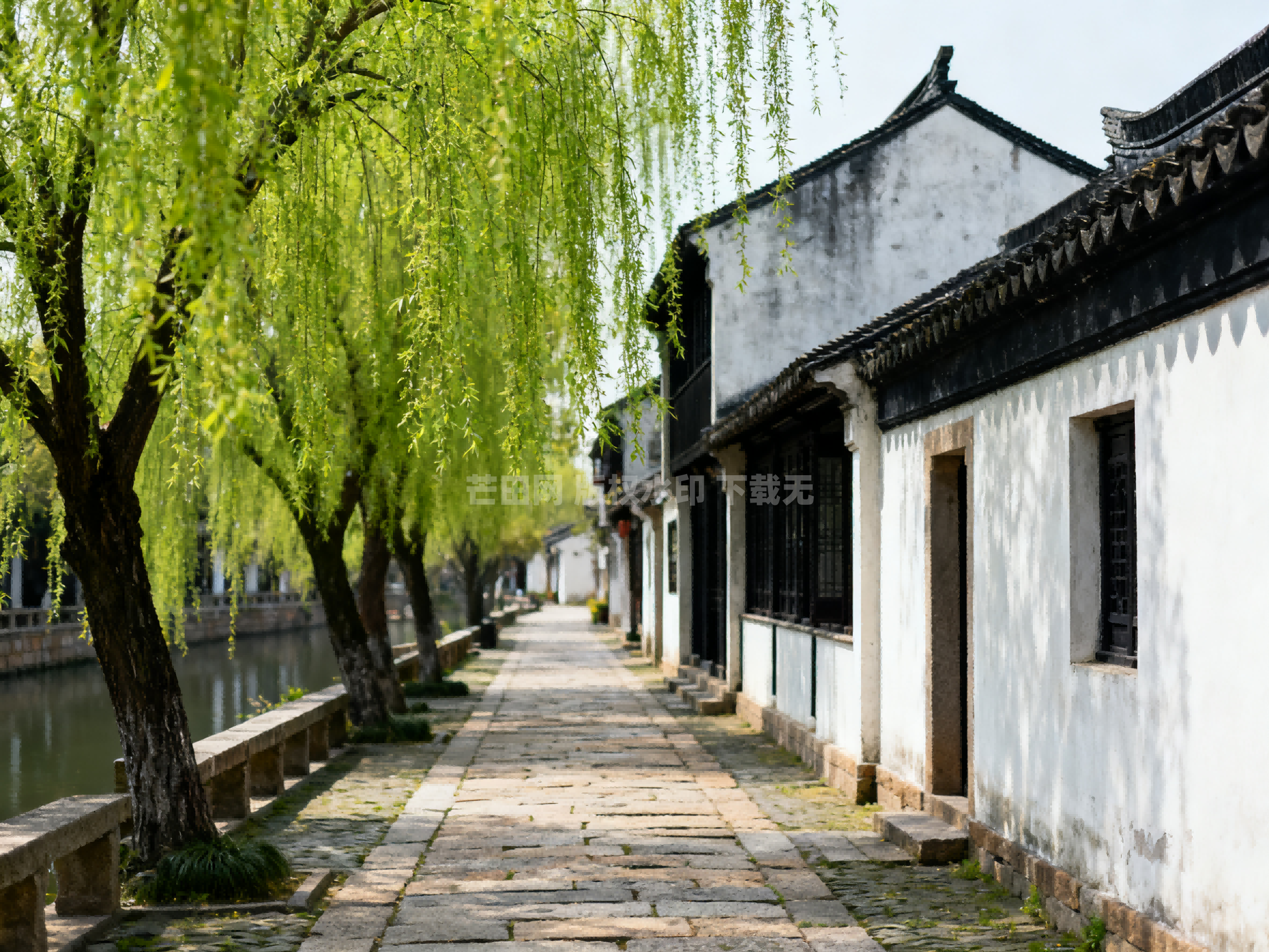 古镇白墙黑瓦旁的垂柳-春天自然风景春日