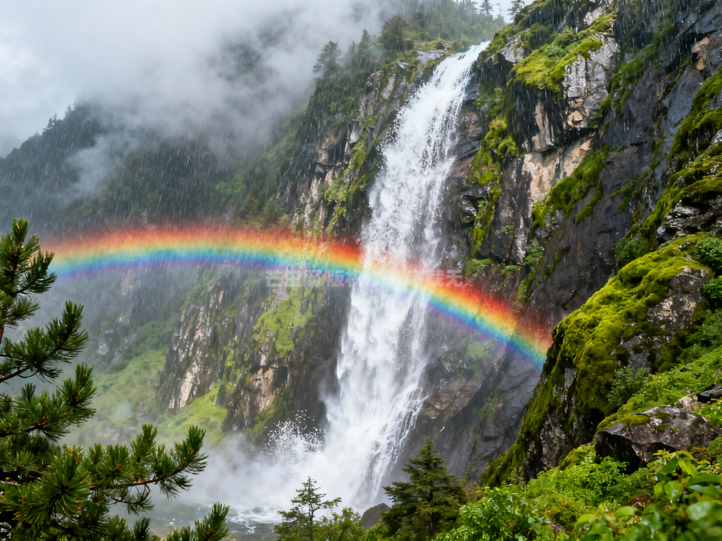 雨后山间挂着彩虹的瀑布-春天自然风景春日