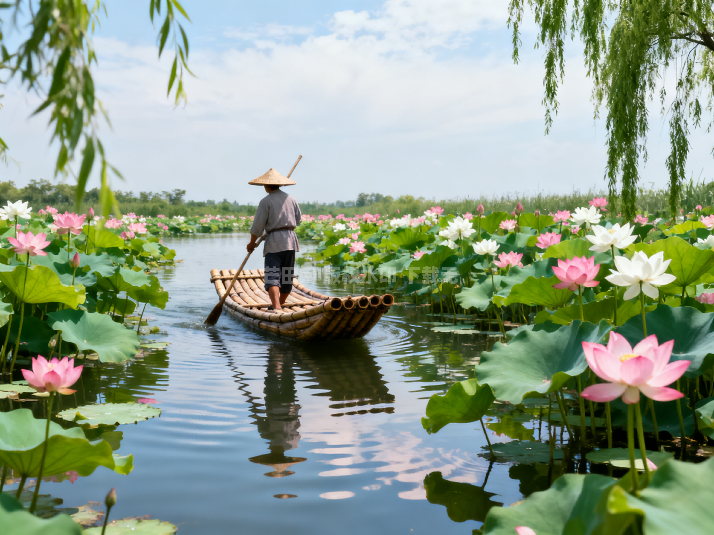 竹筏划过开满荷花的池塘-春天自然风景春日