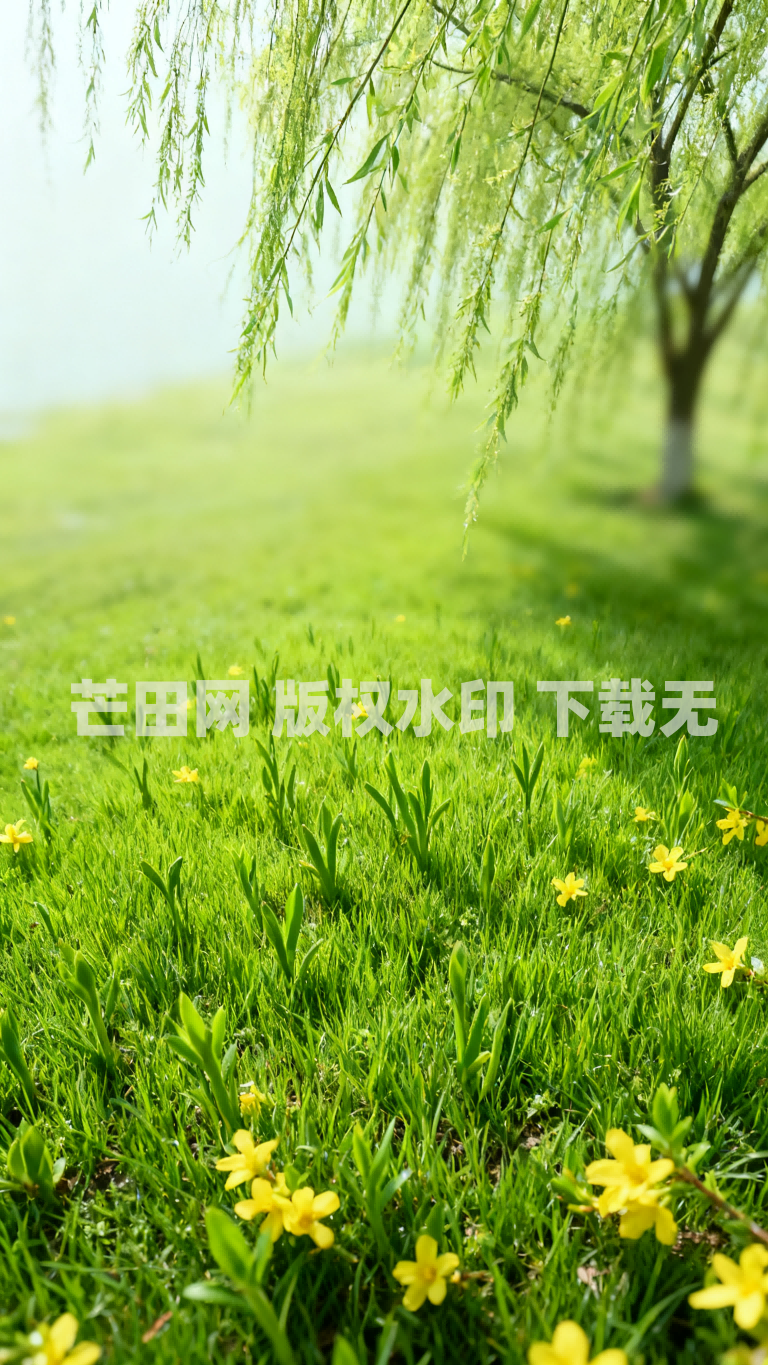 杨柳草坪黄花春季春日春天自然风景