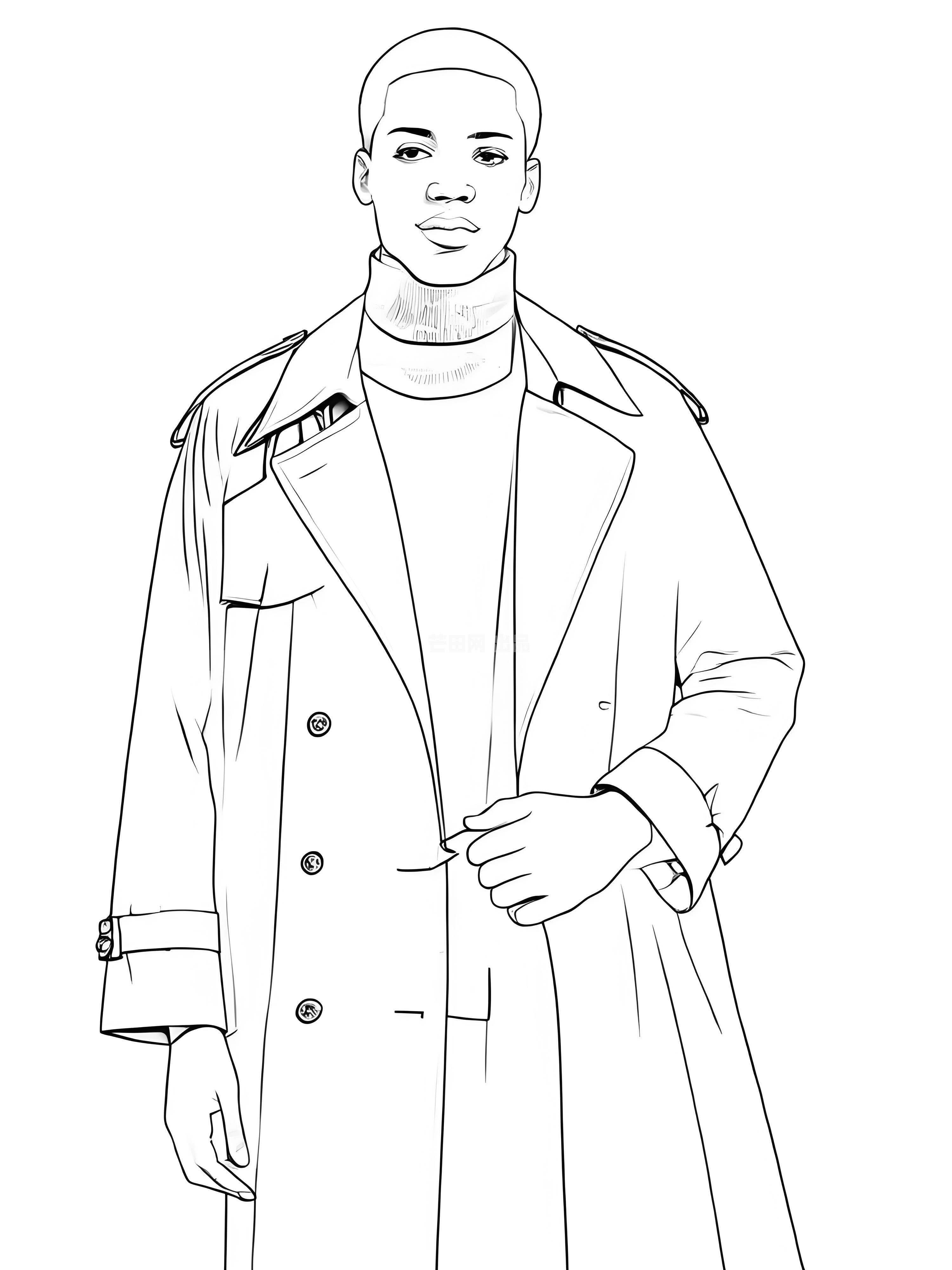 标签:时尚肖像,高领羊毛衫,深灰风衣,白色背景,侧光阴影,挺拔站姿 说明:下载后无水印